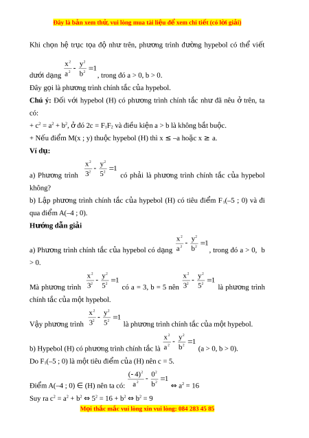 Đây là bản xem th , vu ử i lòng mua tài li u ệ đ xe ể m chi ti t (c ế ó l i ờ gi i ả ) Khi ch n ọ hệ tr c ụ t a ọ độ như trên, phư ng ơ trình đư ng ờ hypebol có thể vi t ế 2 2 x y 1 dư i ớ d ng ạ 2 2 a b