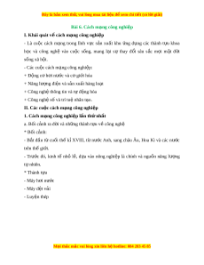 I. Khái quát v cách m ề ng công nghi ạ p ệ - Là cu c ộ cách m ng ạ trong lĩnh v c ự s n ả xu t ấ khu ng ứ d ng ụ các thành t u ự khoa h c ọ và công nghệ vào cu c ộ s ng, ố mang l i ạ sự thay đ i ổ sâu s c ắ m i ọ m t ặ đ i ờ sống xã h i ộ . - Các cu c cách ộ m ng công nghi ạ p: ệ + Đ ng ộ c h ơ i ơ nư c ớ và c gi ơ i ớ hóa + Năng lư ng ợ đi n và s ệ n ả xu t ấ hàng lo t ạ + Công ngh t ệ hông tin và t đ ự ng ộ hóa + Công ngh s ệ ố và trí tu nhân t ệ o. ạ II. Các cu c cách m ộ ng công nghi ạ p ệ