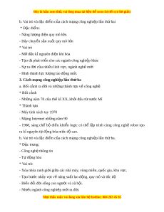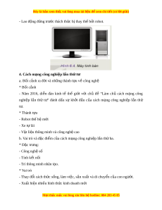 ậ trình cùng công nghệ robot t o ạ ra kỉ nguyên t đ ự ng hóa m ộ c ứ đ cao. ộ b. Vai trò và đ c ặ đi m ể c a cách ủ m ng công nghi ạ p l ệ n t ầ h ba. ứ * Đặc tr ng: ư - Công nghệ thông tin - T đ ự ng hóa ộ * Vai trò: - Xóa nhòa ranh gi i ớ gi a các ữ nhà máy, vùng mi n, qu ề c gi ố a, khu v c. ự - T o b ạ ư c ớ nh y v ả t ọ v năng s ề u t ấ lao đ ng, quy m ộ ô và t c đ ố ộ - Bi n đ ế ổi đ i ờ sống con ngư i ờ và xã h i ộ . - Nhi u ngành công nghi ề p m ệ i ớ ra đ i ờ . M i