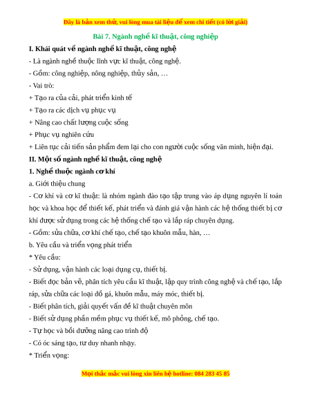 Đây là bản xem th , vu ử i lòng mua tài li u ệ đ xe ể m chi ti t (c ế ó l i ờ gi i ả ) Bài 7. Ngành ngh kĩ ề thu t ậ , công nghi p ệ I. Khái quát v ngà ề nh ngh kĩ ề thu t ậ , công nghệ - Là ngành ngh t ề hu c l ộ ĩnh v c kĩ ự thu t ậ , công ngh . ệ