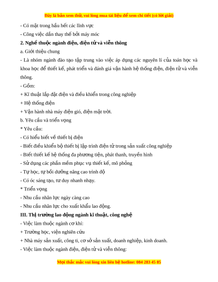 Đây là bản xem th , vu ử i lòng mua tài li u ệ đ xe ể m chi ti t (c ế ó l i ờ gi i ả ) - Có m t ặ trong h u h ầ t ế các lĩnh v c ự - Công vi c d ệ n t ầ hay th b ế i ở máy móc 2. Ngh t ề hu c ngành đ ộ i n, đi ệ n t ệ và vi ử n t ễ hông a. Gi i ớ thi u chung ệ - Là nhóm ngành đào t o ạ t p ậ trung vào vi c ệ áp d ng ụ các nguyên lí c a ủ toán h c ọ và khoa h c ọ để thi t ế k , ế phát tri n ể và đánh giá v n ậ hành h ệ th ng ố đi n, ệ đi n ệ t ử và vi n ễ thông. - Gồm: + Kĩ thu t ậ l p đ ắ t ặ đi n và đi ệ u khi ề n t ể rong công nghi p ệ + H t ệ hống đi n ệ + V n hành nhà ậ máy đi n gi ệ ó, đi n m ệ t ặ tr i ờ . b. Yêu cầu và tri n v ể ng ọ * Yêu cầu: - Có hi u bi ể t ế về thi t ế b đi ị n ệ - Bi t ế đi u khi ề n b ể ộ thi t ế b l ị p ậ trình đi n t ệ t ử rong s n ả xu t ấ công nghi p ệ - Bi t ế thi t ế k h ế t ệ h ng đa ph ố ư ng t ơ i n, phát ệ thanh, truy n hì ề nh - S d ử ng các ụ phần m m ề ph c ụ v t ụ hi t ế k , m ế ô ph ng ỏ - T h ự c, t ọ ự bồi dư ng ỡ nâng cao trình độ - Có óc sáng t o, ạ t duy nhanh nh ư y ạ . * Tri n v ể ng ọ - Nhu c u nhân l ầ c ngày càng ự cao - Nhu c u nhân l ầ c cho xu ự t ấ kh u l ẩ ao đ ng. ộ III. Thị trư ng l ờ ao đ ng ngành kĩ ộ thu t ậ , công nghệ - Vi c l ệ àm thu c ngành c ộ ơ khí: + Trư ng h ờ c, ọ vi n nghi ệ ên c u ứ + Nhà máy s n ả xu t ấ , công ti, c s ơ s ở n xu ả t ấ , doanh nghi p, ki ệ nh doanh. - Vi c l ệ àm thu c ngành đi ộ n, đi ệ n t ệ và vi ử n t ễ hông: M i