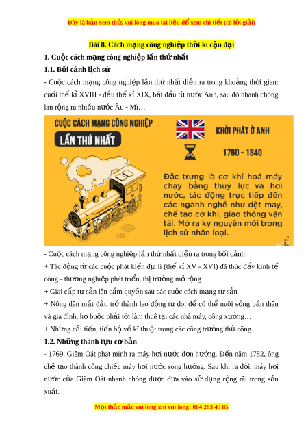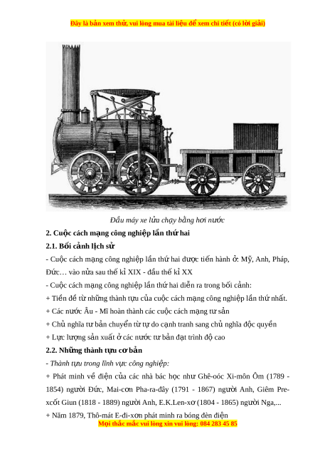 Đây là bản xem th , vu ử i lòng mua tài li u ệ đ xe ể m chi ti t ế (có l i ờ gi i ả ) Đầu máy xe l a ch ử y ạ b ng h ằ i ơ nư c ớ 2. Cu c cách m ộ ạng công nghi p l ệ n t ầ h hai ứ 2.1. B i ố cảnh l ch s ị ử - Cu c ộ cách m ng ạ công nghi p ệ l n ầ th ứ hai đư c ợ ti n ế hành : ở M , ỹ Anh, Pháp, Đ c… vào n ứ a ử sau th k ế X ỉ IX - đ u t ầ h k ế X ỉ X - Cu c cách ộ m ng công nghi ạ ệp lần th hai ứ di n r ễ a trong b i ố c nh: ả + Ti n đ ề t ề nh ừ ng t ữ hành t u c ự a ủ cu c ộ cách m ng công ạ nghi p l ệ n t ầ h nh ứ t ấ .