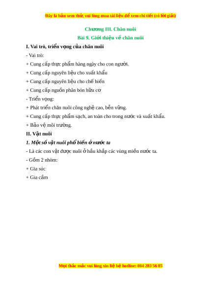 Đây là bản xem th , vu ử i lòng mua tài li u ệ đ xe ể m chi ti t (c ế ó l i ờ gi i ả ) Chư ng ơ III. Chăn nuôi Bài 9. Gi i ớ thi u v ệ chă ề n nuôi I. Vai trò, tri n v ể ng c ọ a chăn n ủ uôi - Vai trò: + Cung c p t ấ h c ự ph m ẩ hàng ngày cho con ngư i ờ . + Cung c p nguyên l ấ i u cho ệ xu t ấ kh u ẩ + Cung c p nguyên l ấ i u cho ệ ch bi ế n ế + Cung c p ngu ấ n phân bón h ồ u ữ c ơ - Tri n ể v ng: ọ + Phát tri n chăn nuôi ể công ngh cao, b ệ n v ễ ng. ữ + Cung c p t ấ h c ự ph m ẩ s ch, ạ