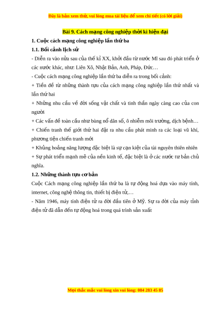 Bài 9. Cách mạng công nghi p t ệ h i ờ kì hi n đ ệ i ạ 1. Cu c cách m ộ ạng công nghi p l ệ n t ầ h ba ứ 1.1. B i ố cảnh l ch s ị ử - Di n ễ ra vào n a ử sau c a ủ th k ế ỉXX, kh i ở đ u ầ t ừ nư c ớ Mĩ sau đó phát tri n ể ở các nư c ớ khác, nh : ư Liên Xô, Nh t ậ B n, ả Anh, Pháp, Đ c… ứ - Cu c cách ộ m ng công nghi ạ ệp lần th ba di ứ n r ễ a trong b i ố c nh: ả + Ti n ề đề từ nh ng ữ thành t u ự c a ủ cách m ng ạ công nghi p ệ l n ầ thứ nh t ấ và lần thứ hai + Nh ng ữ nhu c u ầ về đ i ờ s ng ố v t ậ ch t ấ và tinh th n ầ ngày càng cao c a ủ con ngư i ờ + Các v n đ ấ t ề oàn c u nh ầ ư bùng n dân s ổ , ố ô nhi m ễ môi trư ng, d ờ ch b ị nh… ệ + Chi n ế tranh thế gi i ớ thứ hai đ t ặ ra nhu c u ầ phát minh ra các lo i ạ vũ khí, phư ng t ơ i n chi ệ n t ế ranh m i ớ + Kh ng ho ủ ng năng ả lư ng đ ợ c ặ bi t ệ là s c ự n ạ ki t ệ c a ủ tài nguyên thiên nhiên + Sự phát tri n ể m nh ạ mẽ c a ủ n n ề kinh t , ế đ c ặ bi t ệ là ở các nư c ớ t ư b n ả chủ nghĩa.