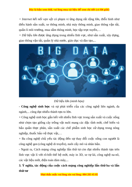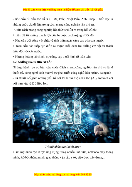Đây là bản xem th , vu ử i lòng mua tài li u ệ đ xe ể m chi ti t (c ế ó l i ờ gi i ả ) - B t ắ đ u ầ từ đ u ầ thế kỉ XXI. Mĩ, Đ c, ứ Nh t ậ B n, ả Anh, Pháp… ti p ế t c ụ là nh ng qu ữ ốc gia đi đ u t ầ rong cách m ng công ạ nghi p l ệ n t ầ h t ứ . ư - Cu c ộ cách m ng ạ công nghi p l ệ n t ầ h t ứ di ư n r ễ a trong b i ố c nh: ả + Ti n đ ề ề t nh ừ ng t ữ hành t u c ự a ba ủ cu c cách ộ m ng t ạ rư c đó ớ + Nhu c u đ ầ i ờ sống v t ậ ch t ấ và tinh th n ngày ầ càng cao c a ủ con ngư i ờ + Toàn c u ầ hóa ti p ế t c ụ di n ễ ra m nh ạ m , ẽ đem l i ạ nh ng ữ cơ h i ộ và thách th c ứ đối v i ớ các nư c. ớ + Kh ng ho ủ ng ả tài chính, n công, s ợ uy thoái kinh t t ế oàn c u ầ
