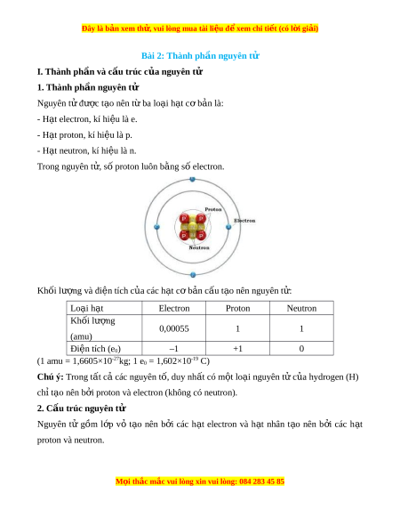 1. Thành ph n nguyên t ầ ử Nguyên t đ ử ư c t ợ o ạ nên t ba l ừ o i ạ h t ạ c b ơ n ả là: - H t ạ electron, kí hi u l ệ à e. - H t ạ proton, kí hi u l ệ à p. - H t ạ neutron, kí hi u l ệ à n. Trong nguyên t , s ử ố proton luôn b ng ằ s el ố ectron. Khối lư ng và đi ợ n t ệ ích c a ủ các h t ạ c b ơ n ả c u t ấ o ạ nên nguyên t : ử Lo i ạ h t ạ Electron Proton Neutron Kh i ố lư ng ợ 0,00055 1 1 (amu) Đi n t ệ ích (e0) –1 +1 0
