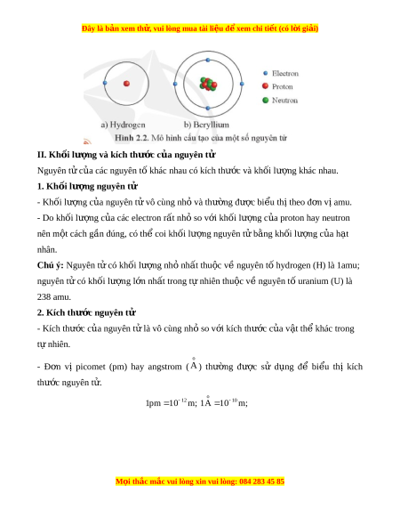 Đây là bản xem th , vu ử i lòng mua tài li u ệ đ xe ể m chi ti t (c ế ó l i ờ gi i ả ) II. Kh i ố lư ng và kí ợ ch thư c ớ c a ng ủ uyên tử Nguyên t c ử a các ủ nguyên t khác ố nhau có kích thư c ớ và kh i ố lư ng ợ khác nhau. 1. Kh i ố lư ng nguyên t ợ ử - Khối lư ng c ợ a nguyên ủ t vô cùng nh ử và t ỏ hư ng ờ đư c bi ợ u t ể h t ị heo đ n v ơ am ị u. - Do khối lư ng c ợ a các ủ electron r t ấ nh s ỏ o v i ớ kh i ố lư ng c ợ a pr ủ oton hay neutron nên m t