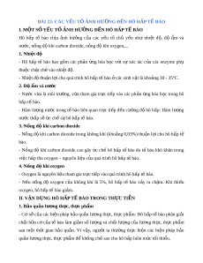 BÀI 22: CÁC Y U Ế T Ố N Ả H HƯ N Ở G Đ N Ế HÔ H P Ấ T B Ế ÀO I. M T Ộ S Ố YẾU T Ố ẢNH HƯ N Ở G Đ N Ế HÔ H P Ấ T B Ế ÀO Hô h p ấ tế bào ch u ị nh ả hư ng ở c a ủ các y u ế tố chủ y u ế như nhi t ệ đ , ộ độ m ẩ và nư c, ớ nồng đ khí ộ carbon dioxide, n ng đ ồ kh ộ í oxygen,... 1. Nhi t ệ đ ộ - Hô h p ấ tế bào bao g m ồ các ph n ả ng ứ hóa h c ọ v i ớ sự xúc tác c a ủ các enzyme phụ thu c ộ ch t ặ ch vào nhi ẽ t ệ đ . ộ - Nhi t ệ đ t ộ hu n l ậ i ợ cho quá trình hô h p t ấ bào ế các ở sinh v t ậ là kho ng 30 - ả 35°C. 2. Độ m ẩ và nư c ớ - Nước v a ừ là môi trư ng, ờ v a ừ tham gia tr c ự ti p ế vào các ph n ả ng ứ hóa h c ọ trong hô hấp t bào. ế - Hàm lư ng ợ nư c ớ trong t ế bào liên quan tr c ự ti p ế đ n ế cư ng ờ đ ộ hô h p: ấ Hàm lư ng ợ nư c ớ th p s ấ ẽ c ch ứ ế s hô h ự p t ấ bào. ế 3. N ng ồ đ kh ộ í carbon dioxide - Nồng đ