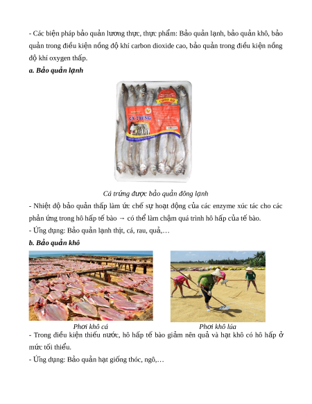 b. Bảo quản khô Ph i ơ khô cá Ph i ơ khô lúa - Trong đi u ề ki n ệ thi u ế nư c, ớ hô h p ấ tế bào gi m ả nên quả và h t ạ khô có hô h p ấ ở m c ứ tối thi u. ể - ng d Ứ ng: ụ B o ả qu n h ả t ạ gi ng t ố hóc, ngô,…