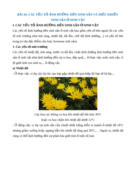 BÀI 34: CÁC Y U Ế TỐ N Ả H HƯ N Ở G Đ N Ế SINH S N Ả VÀ ĐI U Ề KHI N Ể SINH SẢN SI Ở NH V T Ậ I. CÁC Y U Ế TỐ N Ả H HƯ N Ở G Đ N Ế SINH S N Ả SI Ở NH V T Ậ Các y u ế tố nh ả hư ng ở đ n ế sinh s n ả ở sinh v t ậ bao g m ồ y u ế t ố bên ngoài (là các y u ế tố môi trư ng ờ như ánh sáng, nhi t ệ đ , ộ độ m