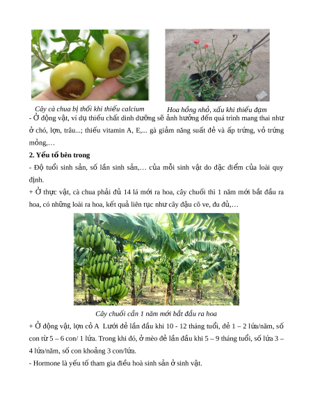 ụ xoài, táo, cúc,...); thi u ế đ m ạ thì hoa nh , x ỏ u ấ (ví dụ hoa cúc, hoa h ng,... ồ ), nh ng ư n u ế bón nhi u ề đ m ạ cây cũng ch m ậ ra hoa, h t ạ lép (ví d l ụ úa); thi u cal ế cium thì qu b ả t ị h i ố , h ng ( ỏ ví d cà chua) ụ . Cây cà chua b t ị h i ố khi thi u ế calcium Hoa hồng nh , x ỏ ấu khi thi u đ ế m ạ - Ở đ ng ộ v t ậ , ví dụ thi u ế ch t ấ dinh dư ng ỡ s ẽ nh ả hư ng ở đ n ế quá trình mang thai như ở chó, l n, ợ trâu...; thi u ế vitamin A, E,... gà gi m ả năng su t ấ đẻ và p ấ tr ng, ứ vỏ tr ng ứ m ng,… ỏ 2. Y u t ế bên t ố rong - Độ tu i ổ sinh s n, ả số l n ầ sinh s n,… ả c a ủ m i ỗ sinh v t ậ do đ c ặ đi m ể c a ủ loài quy định. + Ở th c ự v t ậ , cà chua ph i ả đủ 14 lá m i ớ ra hoa, cây chu i ố thì 1 năm m i ớ b t ắ đ u ầ ra hoa, có nh ng l ữ oài ra hoa, k t ế qu l ả iên t c ụ nh cây đ ư u ậ cô ve, đu đ ,… ủ Cây chuối c n 1 năm ầ m i ớ b t ắ đ u r ầ a hoa + Ở đ ng ộ v t ậ , l n ợ cỏ A Lư i ớ đ ẻ l n ầ đ u ầ khi 10 - 12 tháng tu i ổ , đ ẻ 1 – 2 l a/ ứ năm, số con từ 5 – 6 con/ 1 l a.