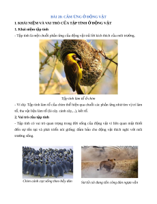 BÀI 28: CẢM N Ứ G Đ Ở N Ộ G V T Ậ I. KHÁI NI M Ệ VÀ VAI TRÒ C A Ủ T P Ậ TÍNH Đ Ở N Ộ G V T Ậ 1. Khái ni m ệ t p t ậ ính - T p t ậ ính là m t ộ chuỗi ph n ả ng c ứ a đ ủ ng ộ v t ậ tr l ả i ờ kích thích c a ủ môi trư ng. ờ T p ậ tính làm t ổ chi ở m - Ví d : ụ T p ậ tính làm t ổ c a ủ chim th ể hi n ệ qua chu i ỗ các ph n ả ng ứ nh ư tìm v ịtrí làm tổ, tha v t ậ li u l ệ àm t (