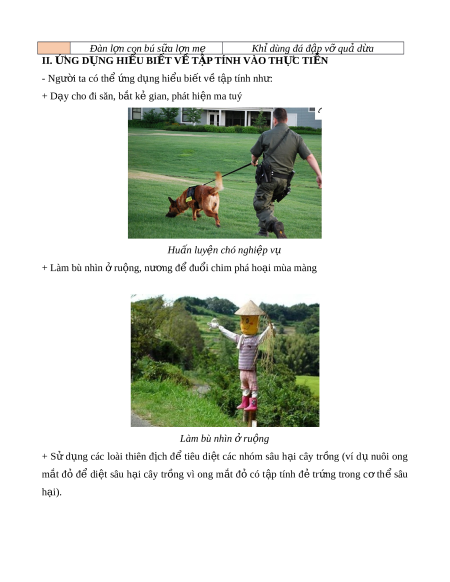 ợ hình thành thông qua h c ọ t p ậ và đi m ể rút kinh nghi m ệ . - Đặc tr ng cho l ư oài. - Đặc tr ng cho t ư ng cá t ừ h . ể - Nh n ệ giăng t , ơ thú con bú s a ữ - Đ ng ộ v t ậ ch y ạ tr n ố khi bị đu i ổ b t ắ , mẹ,… khỉ trèo lên ghế l y ấ th c ứ ăn trên cao ho c dùng đá ặ đ p h ậ t ạ c ng đ ứ ăn,… ể Ví dụ Đàn l n con bú s ợ a ữ l n m ợ ẹ Khỉ dùng đá đ p v ậ ỡ qu d ả a ừ II. N Ứ G D N Ụ G HI U Ể BI T Ế V Ề T P Ậ TÍNH VÀO TH C Ự TI N Ễ - Ngư i ờ ta có thể ng d ứ ng hi ụ u bi ể t ế v t ề p ậ tính nh : ư + D y ạ cho đi săn, b t ắ k gi ẻ an, phát hi n m ệ a tuý Huấn luy n chó nghi ệ p v ệ ụ + Làm bù nhìn r ở u ng, n ộ ư ng đ ơ đu ể i ổ chim phá ho i ạ mùa màng Làm bù nhìn r ở u ng ộ + Sử d ng ụ các loài thiên đ ch ị đ ể tiêu di t ệ các nhóm sâu h i ạ cây tr ng ồ (ví d ụ nuôi ong m t ắ đỏ để di t ệ sâu h i ạ cây tr ng ồ vì ong m t ắ đ ỏ có t p ậ tính đ ẻ tr ng ứ trong c ơ th ể sâu h i ạ ).