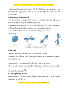 ọ là electron s, các electron phân l ở p p đ ớ ư c ợ g i ọ là electron p…. 3. Số lư ng orbi ợ tal trong m t ộ phân l p, t ớ rong m t ộ l p ớ - Trong m t ộ phân l p, các or ớ bital có cùng m c ứ năng lư ng. ợ + Phân l p s ớ : có 1 AO s . + Phân l p p: ớ có 3 AO px, py, pz . + Phân l p d: ớ có 5 AO . + Phân l p f ớ : có 7 AO . - Trong l p el ớ ectron th n có n ứ 2 AO (n ≤ 4). M i ọ th c ắ m c