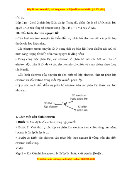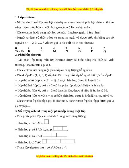 Đây là bản xem th , vu ử i lòng mua tài li u ệ đ xe ể m chi ti t (c ế ó l i ờ gi i ả ) 1. L p el ớ ectron - Nh ng el ữ ectron l ở p g ớ n h ầ t ạ nhân b hú ị t m nh ạ h n v ơ phí ề a h t ạ nhân, vì th có ế năng lư ng ợ th p h ấ n ơ so v i ớ nh ng ữ electron l ở p xa h ớ t ạ nhân. - Các electron thu c ộ cùng m t ộ l p có m ớ c ứ năng lư ng g ợ n b ầ ng nhau. ằ - Ngư i