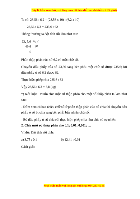 Ta có: 23,56 : 6,2 = (23,56 x 10) : (6,2 x 10) 23,56 : 6,2 = 235,6 : 62 Thông thư ng t ờ a đ t ặ tính r i ồ làm nh s ư au: 23, 5,6 6, 2 49 6 3,8 0 Ph n t ầ h p phân c ậ a ủ s 6,2 có m ố t ộ chữ s . ố Chuy n ể d u ấ ph y ẩ c a ủ số 23,56 sang bên ph i ả m t ộ chữ số đư c ợ 235,6; bỏ dấu phẩy s ở ố 6,2 đư c ợ 62. Th c hi ự n phép chi ệ a 235,6 : 62 V y ậ 23,56 : 6,2 = 3,8 (kg) *) K t ế lu n: ậ Mu n ố chia m t ộ số th p ậ phân cho m t ộ số th p ậ phân ta làm như sau: - Đ m