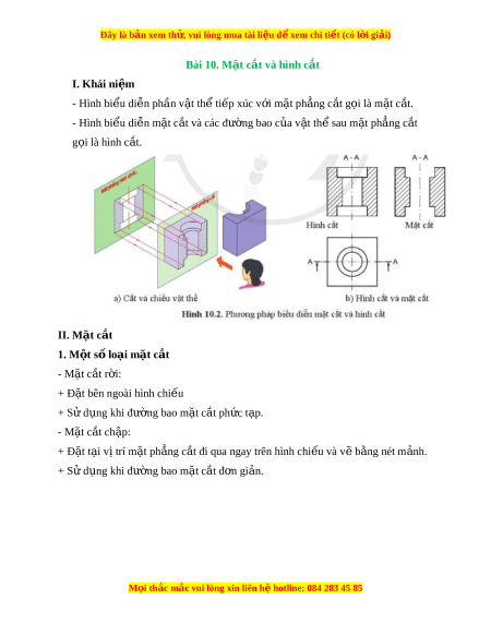 Đây là bản xem th , vu ử i lòng mua tài li u ệ đ xe ể m chi ti t (c ế ó l i ờ gi i ả ) Bài 10. M t ặ cắt và hình c t ắ I. Khái ni m ệ - Hình bi u di ể n ph ễ n v ầ t ậ th t ể i p xúc v ế i ớ m t ặ ph ng c ẳ t ắ g i ọ là m t ặ c t ắ . - Hình bi u di ể n m ễ t ặ c t ắ và các đư ng bao c ờ a ủ v t ậ th s ể au m t ặ ph ng ẳ c t ắ g i ọ là hình c t ắ . II. Mặt c t ắ 1. M t ộ s l ố oại mặt c t ắ - M t ặ c t ắ r i ờ : + Đ t ặ bên ngoài hình chi u ế + S d ử ng khi ụ đư ng ờ bao m t ặ c t ắ ph c t ứ p. ạ - M t ặ c t ắ ch p: ậ + Đ t ặ t i ạ v t ị rí m t ặ ph ng c ẳ t