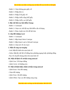 Đây là bản xem th , vu ử i lòng mua tài li u ệ đ xe ể m chi ti t (c ế ó l i ờ gi i ả ) - Bư c ớ 2: Ch n không gi ọ an gi y v ấ ẽ - Bư c ớ 3: Nh p đ ậ n ơ vị - Bư c ớ 4: Nh p t ậ l ỉ gi ệ y v ấ ẽ - Bư c ớ 5: Nh p chi ậ u ề r ng kh ộ gi ổ y ấ - Bư c ớ 6: Nh p chi ậ u ề cao kh gi ổ y ấ 3. Bật ch đ ế t ộ ruy b t ắ đi m ể Osmap - Bư c ớ 1: Command - Bư c ớ 2: Ch n các ọ ch đ ế t ộ ruy b t ắ đi m ể c n s ầ d ử ng ụ - Bư c ớ 3: Nháy chu t ộ vào OK đ k ể t ế thúc 4. L p đ ớ i ố tư ng L ợ ayer - Bư c ớ 1: Command - Bư c ớ 2: H p t ộ ho i ạ Select Linetype - Bư c ớ 3: H p t ộ ho i ạ Load or Reload Linetype - Bư c ớ 4: Ch n nét ọ v cho ẽ layer 5. M t ộ s cong c ố t ụ r gi ợ úp - Grid: B t ậ /t t ắ lư i ớ trên màn hình vẽ - Ortho: B t ậ /t t ắ chế đ v ộ t ẽ h ng t ẳ heo phư ng ơ ngang ho c ặ phư ng đ ơ ng ứ - Pan: Di chuy n khung nhì ể n trên màn hình vẽ III. M t ộ số l nh v ệ c ẽ b ơ n t ả rong autocad - Lệnh Line: V đo ẽ n ạ th ng ẳ - Lệnh Circle: v đ ẽ ư ng ờ tròn IV. M t ộ số l nh h ệ i u ch ệ nh c ỉ b ơ n t ả rong autocad - Lệnh Erase: Xóa đ i ố tư ng ợ - Ch n ọ đối tư ng ợ - Lệnh Trim: C t ắ đ i ố tư ng ợ - Lệnh Offset: T o các đ ạ ối tư ng s ợ ong song M i
