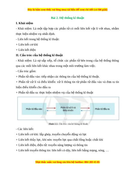 Đây là bản xem th , vu ử i lòng mua tài li u ệ đ xe ể m chi ti t (c ế ó l i ờ gi i ả ) Bài 2. H t ệ h ng kĩ ố thu t ậ I. Khái ni m ệ - Khái ni m ệ : Là m t ộ t p ậ h p ợ các ph n ầ t ử có m i ố liên k t ế v t ậ lí v i ớ nhau, nh m ằ th c ự hi n nhi ệ m ệ v nh ụ t ấ đ nh. ị - Liên k t ế trong h t ệ h ng kĩ ố thu t ậ : + Liên k t ế c khí ơ + Liên k t ế đi n ệ II. Cấu trúc c a h ủ t ệ h ng kĩ ố thu t ậ - Khái ni m ệ : Là sự s p ắ x p, ế tổ ch c ứ các ph n ầ tử bên trong c a ủ h ệ th ng ố thông qua các m i ố liên k t ế khác nhau trong m t ộ môi trư ng l ờ àm vi c. ệ - Cấu trúc gồm: + Ph n t ầ đ ử u vào: ầ ti p nh ế n các ậ thông tin c a ủ h t ệ h ng kĩ ố thu t ậ . + Ph n ầ tử xử lí và đi u ề khi n: