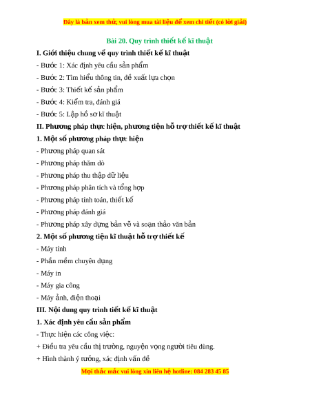 Bài 20. Quy trình thi t ế k k ế ĩ thu t ậ I. Gi i ớ thi u chung v ệ quy t ề rình thi t ế k kĩ ế thu t ậ - Bư c ớ 1: Xác đ nh yêu c ị u s ầ n ph ả m ẩ - Bư c ớ 2: Tìm hi u t ể hông tin, đ xu ề t ấ l a ự ch n ọ - Bư c ớ 3: Thi t ế k s ế n ả ph m ẩ - Bư c ớ 4: Ki m ể tra, đánh giá - Bư c ớ 5: L p h ậ s ồ kĩ ơ thu t ậ II. Phư ng ơ pháp th c hi ự n, ph ệ ư ng t ơ i n h ệ t ỗ r t ợ hi t ế k k ế ĩ thu t ậ 1. M t ộ s ph ố ư ng pháp t ơ h c hi ự n ệ - Phư ng pháp quan s ơ át - Phư ng pháp t ơ hăm dò - Phư ng pháp t ơ hu th p ậ d l ữ i u ệ - Phư ng pháp phân t ơ ích và t ng h ổ p ợ - Phư ng pháp t ơ ính toán, thi t ế kế - Phư ng pháp đánh gi ơ á - Phư ng pháp xây d ơ ng ự b n v ả và s ẽ o n t ạ h o ả văn b n ả 2. M t ộ s ph ố ư ng t ơ i n kĩ ệ thu t ậ h t ỗ r t ợ hi t ế kế - Máy tính - Ph n m ầ m ề chuyên d ng ụ - Máy in - Máy gia công - Máy nh, đi ả n t ệ ho i ạ III. N i