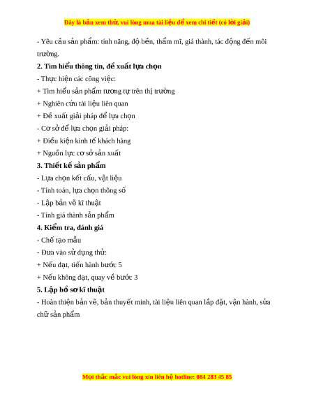 ẩ mĩ, giá thành, tác đ ng đ ộ n m ế ôi trư ng. ờ 2. Tìm hi u t ể hông tin, đ xu ề t ấ l a ch ự n ọ - Th c hi ự n các công ệ vi c: ệ + Tìm hi u s ể n ph ả m ẩ tư ng t ơ t ự rên th t ị rư ng ờ + Nghiên c u ứ tài li u l ệ iên quan + Đ xu ề ất gi i ả pháp đ l ể a ch ự n ọ - Cơ s đ ở l ể a ự ch n gi ọ i ả pháp: + Đi u ki ề n ki ệ nh t khách hàng ế + Nguồn l c c ự ơ s s ở n xu ả t ấ 3. Thi t ế k s ế ản ph m ẩ - L a ch ự n k ọ t ế c u, v ấ t ậ li u ệ - Tính toán, l a ch ự n ọ thông số - L p b ậ n v ả kĩ ẽ thu t ậ - Tính giá thành s n ả ph m ẩ 4. Ki m ể tra, đánh giá - Ch t ế o ạ m u ẫ - Đ a vào s ư d ử ng t ụ h : ử + N u đ ế t ạ , ti n hành b ế ư c ớ 5 + N u không đ ế t ạ , quay v b ề ư c ớ 3 5. Lập hồ s kĩ ơ thu t ậ - Hoàn thi n b ệ n v ả , b ẽ n ả thuy t ế minh, tài li u l ệ iên quan l p ắ đ t ặ , v n ậ hành, s a ử chữ s n ả phẩm M i