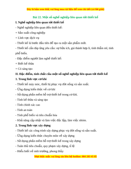 Đây là bản xem th , vu ử i lòng mua tài li u ệ đ xe ể m chi ti t (c ế ó l i ờ gi i ả ) Bài 22. M t ộ số ngh nghi ề p l ệ iên quan t i ớ thi t ế kế I. Ngh ng ề hi p l ệ iên quan t i ớ thi t ế kế - Ngh nghi ề p l ệ iên quan đ n t ế hi t ế k : ế + S n ả xu t ấ công nghi p ệ + Lĩnh v c d ự ch v ị ụ - Thi t ế k l ế à bư c ớ đ u t ầ iên đ t ể o r ạ a m t ộ s n ả ph m ẩ m i ớ . - Thi t ế k c ế n đáp ầ ng yêu c ứ u: ầ sự h u í ữ ch, giá thành h p ợ lí, tính th m ẩ mĩ, tính phổ bi n. ế - Đ c ặ đi m ể ngư i ờ làm ngh t ề hi t ế k : ế + Bi t ế k t ế h a ừ + Có sáng t o ạ II. Đặc đi m ể , tính ch t ấ c a m ủ t ộ s n ố gh nghi ề p l ệ iên quan t i ớ thi t ế kế 1. Trong lĩnh v c ự c khí ơ - Thi t ế k m ế áy móc, thi t ế b ph ị c v ụ đ ụ i ờ s ng và s ố n ả xu t ấ . - ng d Ứ ng ki ụ n t ế h c v ứ ề c khí ơ - S d ử ng ph ụ ần m m ề hỗ tr t ợ hi t ế k t ế rong c khí ơ . - Tính k t ế h a và s ừ áng t o ạ - Tính chính xác cao - Tính an toàn - Tính ph bi ổ n ế và tiêu chu n hóa ẩ - Kh năng ả c p nh ậ t ậ và làm vi c đ ệ c l ộ p, ậ làm vi c ệ nhóm. 2. Trong lĩnh v c ự xây d ng ự - Thi t ế k các ế công trình xây d ng ph ự c ụ v đ ụ i ờ s ng và s ố n xu ả t ấ . - ng d Ứ ng ki ụ n t ế h c chuyên ứ môn v xây d ề ng ự - S d ử ng ph ụ ần m m ề hỗ tr t ợ hi t ế k t ế rong xây d ng ự - Tuân th t ủ iêu chu n, quy ph ẩ m ạ xây d ng, t ự ỉ lệ - Hi u bi ể t ế v m ề ôi trư ng, phong t ờ h y ủ M i