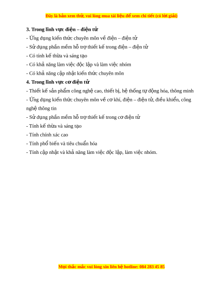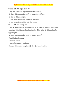 Đây là bản xem th , vu ử i lòng mua tài li u ệ đ xe ể m chi ti t (c ế ó l i ờ gi i ả ) 3. Trong lĩnh v c ự đi n – đi ệ n t ệ ử - ng d Ứ ng ki ụ n t ế h c chuyên ứ môn v đi ề n – đ ệ i n t ệ ử - S d ử ng ph ụ ần m m ề hỗ tr t ợ hi t ế k t ế rong đi n – đ ệ i n t ệ ử - Có tính k t ế h a ừ và sáng t o ạ - Có khả năng làm vi c đ ệ c l ộ p ậ và làm vi c nhóm ệ - Có khả năng c p ậ nh t ậ ki n t ế h c chuyên ứ môn 4. Trong lĩnh v c ự c đi ơ n t ệ ử - Thi t ế k s ế n ph ả m ẩ công ngh cao, t ệ hi t ế b , h ị t ệ h ng t ố đ ự ng hóa, ộ thông minh - ng d Ứ ng ki ụ n t ế h c chuyên ứ môn v c ề khí ơ , đi n – đi ệ n t ệ , đi ử u khi ề n, công ể nghệ thông tin - S d ử ng ph ụ ần m m ề hỗ tr t ợ hi t ế k t ế rong c đi ơ n t ệ ử - Tính k t ế h a và s ừ áng t o ạ - Tính chính xác cao - Tính ph bi ổ n ế và tiêu chu n hóa ẩ - Tính c p nh ậ t ậ và khả năng làm vi c ệ đ c l ộ p, l ậ àm vi c nhóm ệ . M i