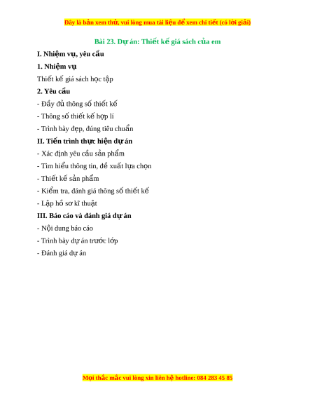 Đây là bản xem th , vu ử i lòng mua tài li u ệ đ xe ể m chi ti t (c ế ó l i ờ gi i ả ) Bài 23. D án: ự Thi t ế k gi ế á sách c a em ủ I. Nhi m ệ v , yêu c ụ u ầ 1. Nhi m ệ vụ Thi t ế k gi ế á sách h c t ọ p ậ 2. Yêu cầu - Đầy đ t ủ hông số thi t ế kế - Thông số thi t ế k h ế p l ợ í
