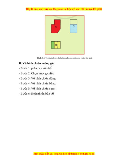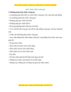 Bài 9. Hình chi u vuông góc ế I. Phư ng pháp h ơ ình chi u vuông góc ế - Là phư ng pháp bi ơ u di ể n các ễ hình chi u vuông góc t ế rên cùng m t ộ m t ặ ph ng. ẳ - Các phư ng pháp hì ơ nh chi u vuông góc: ế + Phư ng pháp ơ góc chi u t ế h nh ứ t ấ + Phư ng pháp ơ góc chi u t ế h ba ứ - N i ộ dung phư ng ơ pháp chi u góc t ế h nh ứ t ấ : + Vị trí v t ậ th : ể đ t ặ trong góc t o ạ b i ở ba m t ặ ph ng vuông góc v ẳ i ớ nhau t ng đôi ừ m t ộ . + Chi u ế v t ậ th b ể ng phép ừ chi u vuông góc ế + Xoay m t ặ ph ng hì ẳ nh chi u b ế ng ằ xu ng 90 ố 0, m t ặ ph ng hì ẳ nh chi u c ế nh ạ sang ph i ả 900 - Tên g i ọ hình chi u: ế + Hình chi u t ế ừ trư c: ớ hình chi u ế đ ng ứ + Hình chi u t ế ừ trên: hình chi u b ế ng ằ + Hình chi u t ế ừ trái: hình chi u c ế nh ạ - Quy đ nh: ị + Số hình chi u ph ế i ả đ t ủ hể hi n hì ệ nh d ng ạ v t ậ thể + Đư ng ờ bao khu t ấ , c nh khu ạ t ấ v nét ẽ đ t ứ m nh ả + Đư ng ờ tr c, ụ đư ng t ờ âm v b ẽ ng nét ằ g ch dài ạ ch m ấ m nh. ả M i