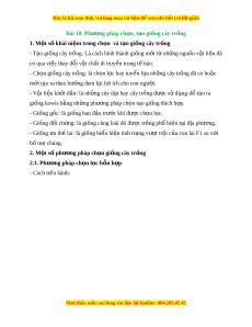 ử vui lòng mua tài li u ệ đ xe ể m chi ti t ế (có l i ờ gi i ả ) - u đi Ư m ể : t o s ạ ự khác bi t ệ rõ theo m c t ụ iêu ch n gi ọ ng. ố - Như c ợ đi m ể : t n nhi ố u t ề h i ờ gian và di n t ệ ích đ t ấ - Đối tư ng: ợ áp d ng cho cây ụ t t ự h ph ụ n, cây nhân gi ấ ống vô tính 2.3. ng d Ứ ng công n ụ gh s ệ inh h c ọ trong ch n gi ọ ng cây t ố r ng ồ - u đi Ư m ể : rút ng n ắ th i ờ gian ch n gi ọ ng ố - Như c ợ đi m ể : chi phí cao - Đối tư ng: ợ áp d ng cho cây ụ nhân giống vô tính. 3. M t ộ s ph ố ư ng pháp t ơ o gi ạ ng cây t ố r ng ồ 3.1. Tạo gi ng b ố ng p ằ hư ng pháp l ơ ai h u t ữ ính - Là s gi ự ao phối gi a hai ữ hay nhi u d ề ng ạ b m ố khác ẹ nhau nh m ằ t o ạ ra các con lai mang nhi u t ề ính tr ng t ạ t ố c a b ủ m ố . ẹ - u đi Ư m ể : + D t ễ h c ự hi n ệ + Đ c ặ tính di truy n ề n đ ổ nh ị + Th h ế s ệ au t l ỉ s ệ inh s n ả cao. - Như c ợ đi m ể : + Tốn nhi u t ề h i ờ gian + Khó lo i ạ b t ỏ ính tr ng ạ không mong mu n. ố 3.2. Tạo gi ng cây t ố r ng b ồ ng p ằ hư ng pháp đ ơ t ộ bi n gen ế