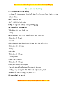 ố oại sâu hai cây tr ng t ồ hư ng ờ g p ặ 2.1. Sâu cu n l ố á nh h ỏ i ạ lúa * Đặc đi m ể sinh h c ọ và gây h i ạ - Tr ng: ứ + Hình b u d ầ c, m ụ àu tr ng, khi ắ s p n ắ ở có màu vàng nh t ạ . + Th i ờ gian: 3 – 5 ngày - Sâu non: + Màu tr ng ắ s a, ữ khi l n m ớ àu xanh lá m , ạ thân chia đ t ố rõ ràng + Th i ờ gian: 15 – 28 ngày - Nh ng: ộ + Màu nâu + Th i ờ gian: 6 – 10 ngày - Trư ng t ờ hành: + Cánh màu vàng r m ơ + Th i ờ gian: 5 – 10 ngày * Biện pháp phòng tr ch ừ ủ y u ế - Theo dõi th i ờ đi m ể đ t ẻ r ng ứ đ phòng t ể r s ừ âu non. - S d ử ng b ụ ẫy đèn d báo t ự h i ờ đi m ể xu t ấ hi n t ệ rư ng ở thành - Bư m ớ xu t ấ hi n 5 – 7 ngày t ệ hì phun thu c. ố 2.2. Sâu t h ơ i ạ rau họ c i ả M i
