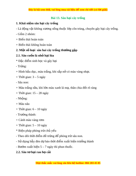ử vui lòng mua tài li u ệ đ xe ể m chi ti t ế (có l i ờ gi i ả ) Bài 13. Sâu h i ạ cây tr ng ồ 1. Khái ni m ệ sâu h i ạ cây tr ng ồ - Là đ ng v ộ t ậ không xư ng ơ s ng t ố hu c l ộ p côn t ớ rùng, chuyên gây h i ạ cây tr ng. ồ - Gồm 2 nhóm: + Bi n ế thái hoàn toàn + Bi n ế thái không hoàn toàn 2. M t ộ s l