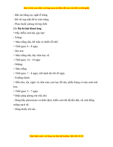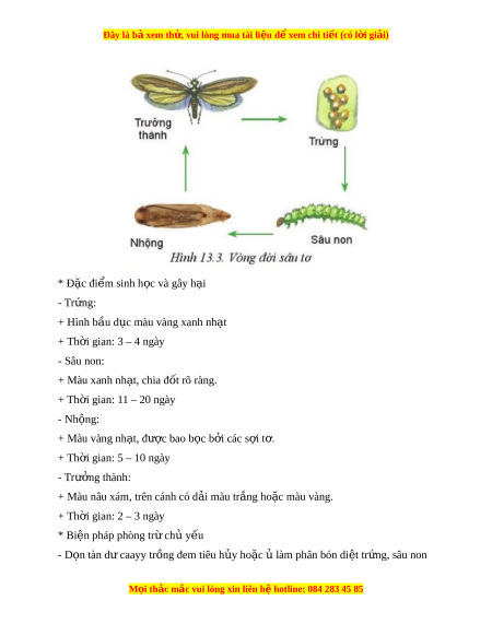 ử vui lòng mua tài li u ệ đ xe ể m chi ti t ế (có l i ờ gi i ả ) * Đặc đi m ể sinh h c ọ và gây h i ạ - Tr ng: ứ + Hình b u d ầ c m ụ àu vàng xanh nh t ạ + Th i ờ gian: 3 – 4 ngày - Sâu non: + Màu xanh nh t ạ , chia đ t ố rõ ràng. + Th i ờ gian: 11 – 20 ngày - Nh ng: ộ + Màu vàng nh t ạ , được bao b c ọ b i ở các s i ợ t . ơ + Th i ờ gian: 5 – 10 ngày - Trư ng t ở hành: