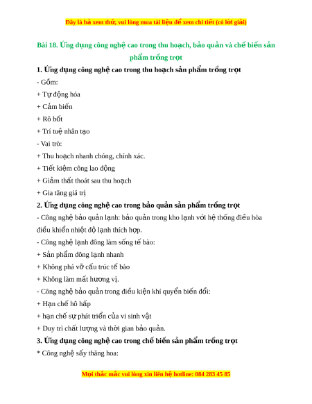 ử vui lòng mua tài li u ệ đ xe ể m chi ti t ế (có l i ờ gi i ả ) Bài 18. ng d Ứ ng công ngh ụ cao t ệ rong thu ho ch, b ạ o q ả u n và ch ả bi ế n s ế n ả ph m ẩ tr ng t ồ r t ọ 1. ng d Ứ ng công n ụ gh cao ệ trong thu ho ch s ạ n ph ả m ẩ tr ng t ồ r t ọ - Gồm: + T đ ự ng ộ hóa + C m ả bi n ế + Rô b t ố + Trí tu nhân t ệ o ạ - Vai trò: + Thu ho ch ạ nhanh chóng, chính xác. + Ti t ế ki m ệ công lao đ ng ộ + Gi m ả th t ấ thoát sau thu ho ch ạ + Gia tăng giá trị 2. ng d Ứ ng công n ụ gh cao ệ trong b o qu ả n s ả n ph ả m ẩ tr ng t ồ r t ọ - Công nghệ b o ả qu n l ả nh: ạ b o ả qu n t ả rong kho l nh v ạ i ớ h t ệ h ng đi ố u hòa ề đi u khi ề n nhi ể ệt đ l ộ nh ạ thích h p. ợ - Công nghệ l nh ạ đông làm s ng t ố bào: ế + S n ả ph m ẩ đông l nh ạ nhanh + Không phá vỡ c u t ấ rúc t bào ế + Không làm m t ấ hư ng v ơ . ị - Công nghệ b o ả qu n t ả rong đi u ki ề n khí ệ quy n ể bi n ế đ i ổ : + H n ạ ch hô h ế p ấ + h n ạ ch s ế ự phát tri n c ể a ủ vi sinh v t ậ + Duy trì ch t ấ lư ng và t ợ h i ờ gian b o ả qu n. ả 3. ng d Ứ ng công n ụ gh cao ệ trong ch b ế i n s ế n ph ả m ẩ tr ng t ồ r t ọ * Công ngh s ệ y t ấ hăng hoa: M i
