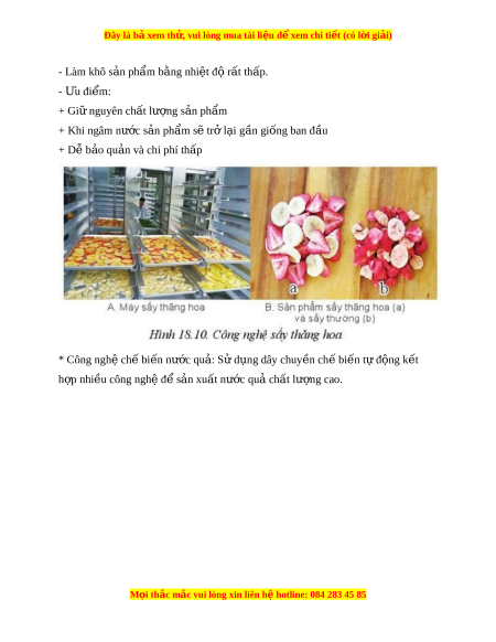ử vui lòng mua tài li u ệ đ xe ể m chi ti t ế (có l i ờ gi i ả ) - Làm khô s n ph ả m ẩ b ng ằ nhi t ệ đ r ộ t ấ th p. ấ - u đi Ư m ể : + Gi nguyên ữ ch t ấ lư ng ợ s n ả ph m ẩ + Khi ngâm nư c ớ s n ả ph m ẩ s t ẽ r l ở i ạ g n gi ầ ng ban đ ố u ầ + D b ễ o ả qu n và ả chi phí th p ấ * Công ngh ch ệ bi ế n n ế ư c ớ qu : ả S d ử ng dây chuy ụ n ề ch bi ế n t ế đ ự ng k ộ t ế h p ợ nhi u ề công ngh đ ệ s ể n ả xu t ấ nư c qu ớ ch ả t ấ lư ng ợ cao. M i