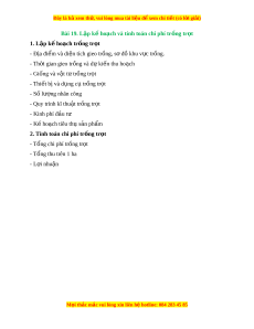 ính toán chi phí tr ng ồ tr t ọ 1. Lập k ho ế ch t ạ r ng t ồ r t ọ - Địa đi m ể và di n t ệ ích gieo tr ng, s ồ ơ đ khu v ồ c ự tr ng. ồ - Th i ờ gian gieo tr ng và ồ d ki ự n t ế hu ho ch ạ - Giống và v t ậ t t ư rồng tr t ọ - Thi t ế b và d ị ng c ụ t ụ r ng t ồ r t ọ - Số lư ng ợ nhân công - Quy trình kĩ thu t ậ tr ng t ồ r t ọ - Kinh phí đ u t ầ ư - K ho ế ch ạ tiêu th s ụ n ả ph m ẩ