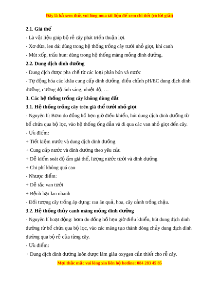 ử vui lòng mua tài li u ệ đ xe ể m chi ti t ế (có l i ờ gi i ả ) 2.1. Giá thể - Là v t ậ li u gi ệ úp b r ộ cây phát ễ tri n ể thu n ậ l i ợ . - X d ơ a, ừ len đá: dùng trong h t ệ h ng t ố r ng cây t ồ ư i ớ nh gi ỏ t ọ , khí canh - Mút xốp, tr u hun: ấ dùng trong h t ệ h ng m ố àng m ng di ỏ nh dư ng. ỡ 2.2. Dung d ch di ị nh dư ng ỡ - Dung d ch đ ị ư c pha ợ ch t ế các ừ lo i ạ phân bón và nư c ớ - T đ ự ng hóa các ộ khâu cung cấp dinh dư ng, ỡ đi u ề ch nh pH ỉ /EC dung d ch di ị nh dư ng, ỡ cư ng đ ờ