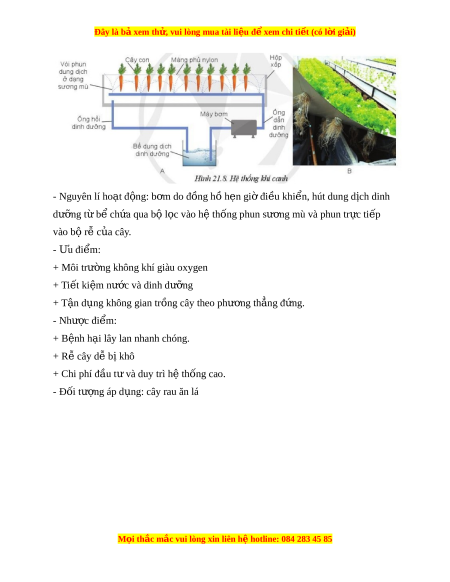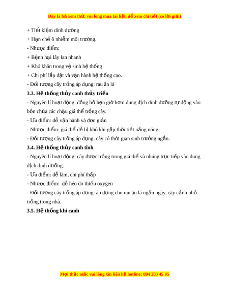 ử vui lòng mua tài li u ệ đ xe ể m chi ti t ế (có l i ờ gi i ả ) - Nguyên lí ho t ạ đ ng: ộ b m ơ do đ ng h ồ h ồ n gi ẹ đi ờ u khi ề n, hút ể dung d ch di ị nh dư ng ỡ t b ừ ch ể a qua ứ b l ộ c vào h ọ t ệ h ng phun s ố ư ng ơ mù và phun tr c ự ti p ế vào bộ r c ễ a ủ cây. - u đi Ư m ể : + Môi trư ng ờ không khí giàu oxygen + Ti t ế ki m ệ nư c ớ và dinh dư ng ỡ + T n d ậ ng không gi ụ an trồng cây theo phư ng t ơ h ng đ ẳ ng. ứ - Như c ợ đi m ể : + B nh h ệ i ạ lây lan nhanh chóng. + Rễ cây d b ễ ị khô + Chi phí đ u t ầ và duy t ư rì h t ệ h ng cao. ố - Đối tư ng áp d ợ ng: ụ cây rau ăn lá M i