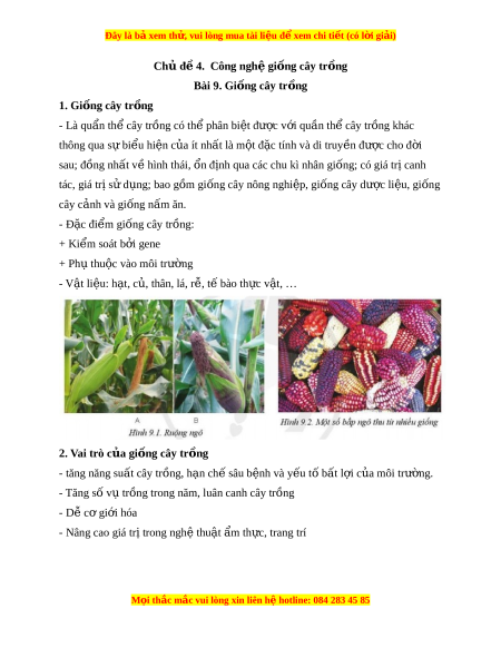 ử vui lòng mua tài li u ệ đ xe ể m chi ti t ế (có l i ờ gi i ả ) Chủ đ 4. C ề ông nghệ gi ng ố cây tr ng ồ Bài 9. Gi ng ố cây tr ng ồ 1. Gi ng cây ố tr ng ồ - Là qu n t ẩ h cây ể tr ng có t ồ h phân bi ể t ệ đư c ợ v i ớ qu n t ầ h cây t ể r ng khác ồ thông qua s bi ự u hi ể ện c a í ủ t nh t ấ là m t ộ đ c ặ tính và di truy n đ ề ư c ợ cho đ i ờ sau; đồng nhất v hì ề nh thái, n đ ổ nh qua các chu ị kì nhân gi ng; ố có giá tr canh ị tác, giá tr s ị ử d ng; ụ bao g m ồ gi ng cây nông nghi ố p, gi ệ ng cây d ố ư c ợ li u, gi ệ ng ố cây c nh và gi ả ống nấm ăn. - Đ c ặ đi m ể giống cây tr ng: ồ + Ki m ể soát b i ở gene + Ph t ụ hu c ộ vào môi trư ng ờ - V t ậ li u ệ : h t ạ , c , t ủ hân, lá, r , t ễ bào t ế h c ự v t ậ , … 2. Vai trò c a gi ủ ng cây t ố r ng ồ