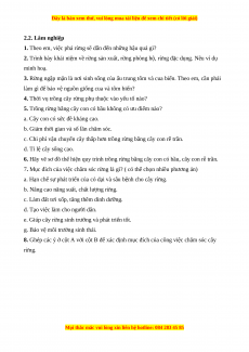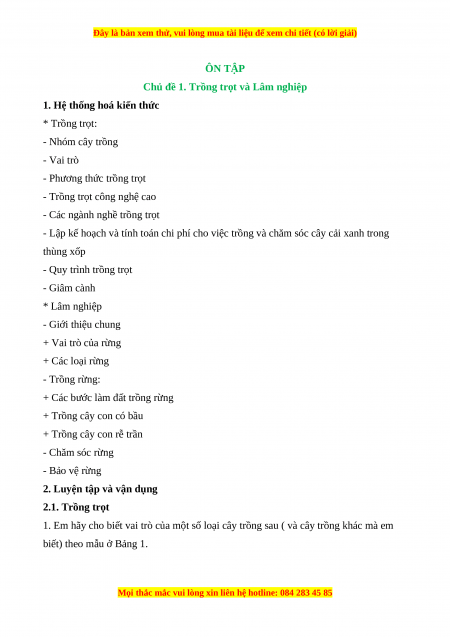 - Lập kế hoạch và tính toán chi phí cho việc trồng và chăm sóc cây cải xanh trong thùng xốp - Quy trình trồng trọt - Giâm cành * Lâm nghiệp - Giới thiệu chung + Vai trò của rừng + Các loại rừng - Trồng rừng: