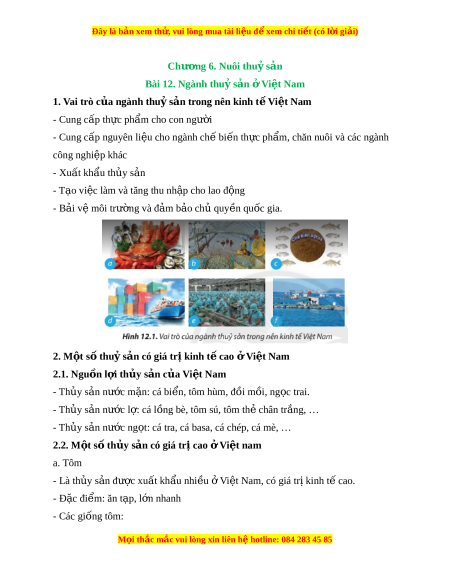 Đây là bản xem th , vu ử i lòng mua tài li u ệ đ xe ể m chi ti t (c ế ó l i ờ gi i ả ) Chư ng ơ 6. Nuôi thu s ỷ n ả Bài 12. Ngành thu s ỷ n ả ở Vi t ệ Nam 1. Vai trò c a n ủ gành thu s ỷ n t ả rong nên kinh t ế Vi t ệ Nam - Cung cấp th c ph ự m ẩ cho con ngư i ờ