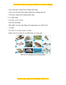 Đây là bản xem th , vu ử i lòng mua tài li u ệ đ xe ể m chi ti t (c ế ó l i ờ gi i ả ) + Tôm càng xanh: sống m ở ôi trư ng ờ nư c ng ớ t ọ + Tôm sú và tôm th chân ẻ tr ng: ắ s ng ố m ở ôi trư ng ờ nư c l ớ ợ + Tôm hùm: s ng ố m ở ôi trư ng n ờ ư c ớ m n. ặ b. Cá nư c ng ớ t ọ - Các lo i ạ : cá tra, cá basa - Nuôi đ xu ể t ấ kh u ẩ - Đ c ặ đi m ể : Da tr n, ơ th t ị tr ng, hàm ắ lư ng ợ đ m ạ cao, d t ễ iêu hóa. c. Cá bi n ể - Các lo i