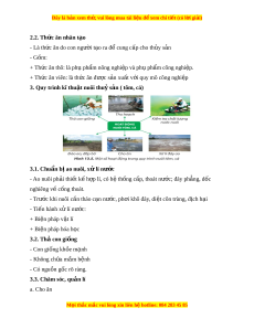 2.2. Thức ăn nhân t o ạ - Là th c ứ ăn do con ngư i ờ t o ạ ra đ cung c ể p cho t ấ h y s ủ n ả - Gồm: + Th c ứ ăn thô: là ph ph ụ m ẩ nông nghi p và ph ệ ụ ph m ẩ công nghi p. ệ + Th c ứ ăn viên: là th c ăn đ ứ ư c ợ s n ả xu t ấ v i ớ quy mô công nghi p ệ 3. Quy trình kĩ thu t ậ nuôi thu s ỷ n ( ả tôm, cá) 3.1. Chuẩn b ao n ị uôi, x l ử í nư c ớ - Ao nuôi ph i ả thi t ế kế h p l ợ í, có h t ệ h ng c ố p, t ấ hoát nư c; ớ đáy ph ng, d ẳ c ố nghiêng về cống thoát. - Trư c khi ớ nuôi cần tháo c n ạ nư c, ph ớ i ơ khô đáy, di t ệ côn trùng, đ ch h ị i ạ - Ti n hành x ế l ử í nư c: ớ + Bi n pháp ệ v t ậ lí + Bi n pháp ệ hóa h c ọ 3.2. Thả con gi ng ố - Con giống kh e m ỏ nh ạ - Không ch a m ứ ầm bệnh - Có nguồn gốc rõ ràng. 3.3. Chăm sóc, qu n l ả í a. Cho ăn M i