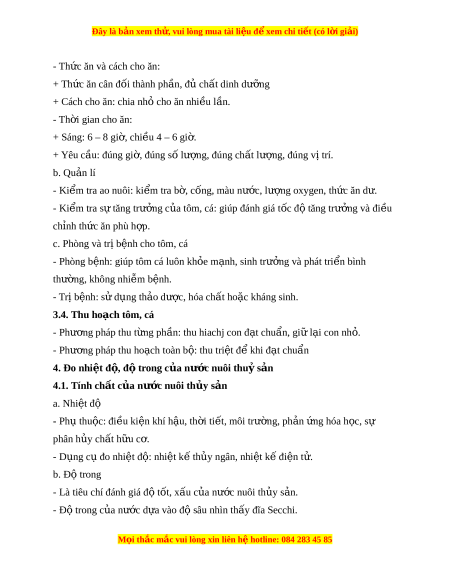ệ : giúp tôm cá luôn kh e ỏ m nh, s ạ inh trư ng ở và phát tri n bì ể nh thư ng, ờ không nhi m ễ b nh. ệ - Trị bệnh: sử d ng t ụ h o d ả ư c, ợ hóa chất ho c ặ kháng sinh. 3.4. Thu ho ch t ạ ôm, cá - Phư ng pháp t ơ hu t ng ph ừ n: ầ thu hiachj con đ t ạ chu n, g ẩ iữ l i ạ con nh . ỏ - Phư ng pháp t ơ hu ho ch ạ toàn b : ộ thu tri t ệ đ khi ể đ t ạ chu n ẩ 4. Đo nhi t ệ đ , đ ộ t ộ rong c a n ủ ư c nuôi ớ thu s ỷ n ả 4.1. Tính ch t ấ c a n ủ ư c nuôi ớ th y s ủ n ả a. Nhiệt độ - Ph t ụ hu c: ộ đi u ki ề n khí ệ h u, t ậ h i ờ ti t ế , môi trư ng, ph ờ n ả ng hóa h ứ c, s ọ ự phân h y ủ ch t ấ h u ữ c . ơ - D ng c ụ đo nhi ụ t ệ đ : ộ nhi t ệ k t ế h y ngân, nhi ủ t ệ k đi ế n t ệ . ử b. Độ trong