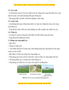 Đây là bản xem th , vu ử i lòng mua tài li u ệ đ xe ể m chi ti t (c ế ó l i ờ gi i ả ) 2.2. Xen canh - Là hình th c ứ canh tác hai hay nhi u ề lo i ạ cây tr ng t ồ rên cùng m t ộ di n t ệ ích, cùng m t ộ lúc hoặc cách m t ộ kho ng t ả h i ờ gian không dài. - T n d ậ ng ụ di n t ệ ích đ t ấ , ch t ấ dinh dư ng và ánh s ỡ áng. 2.3. Luân canh - Là phư ng t ơ h c gi ứ eo tr ng l ồ uân phiên các lo i ạ cây tr ng khác nhau t ồ rên cùng m t ộ diện tích. - Tăng đ phì ộ nhiêu, đi u hòa ề dinh dư ng ỡ cho đ t ấ và gi m ả sâu, b nh cho cây ệ . 2.4. Tăng vụ - Là tăng số v gi ụ eo tr ng t ồ rên m t ộ di n t ệ ích đ t ấ tr ng t ồ rong m t ộ năm. - Tăng tổng s n ả lư ng t ợ hu ho ch. ạ 3. Tr ng t ồ r t ọ công ngh cao ệ - M c ụ đích: + Nâng cao hi u qu ệ ả + T o b ạ ư c đ ớ t ộ phá v năng s ề u t ấ , ch t ấ lư ng nông s ợ n, đáp ả ng ứ nhu c u ngày ầ càng cao c a xã ủ h i ộ . - Đ c ặ đi m ể c b ơ n ả c a t ủ r ng t ồ r t ọ công ngh cao: ệ + ng d Ứ ng quy t ụ