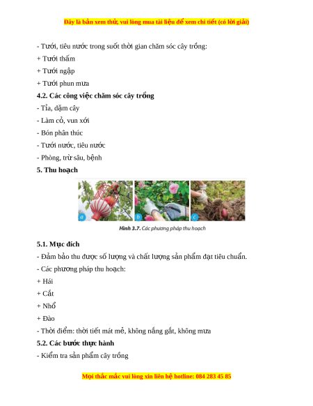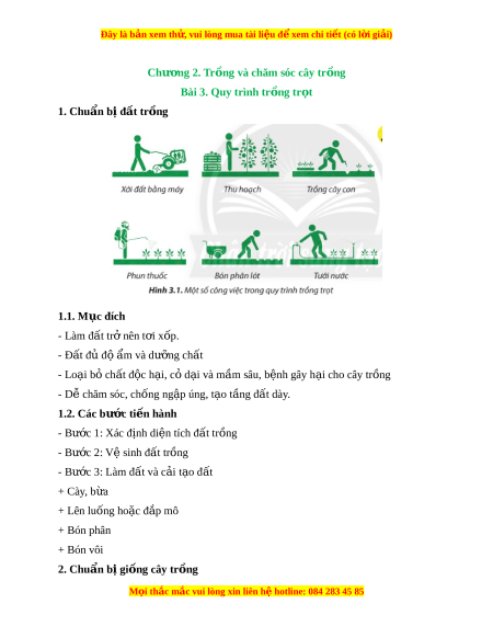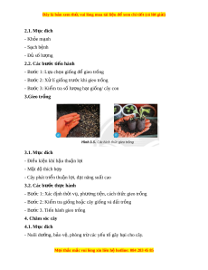 Đây là bản xem th , vu ử i lòng mua tài li u ệ đ xe ể m chi ti t (c ế ó l i ờ gi i ả ) 2.1. Mục đích - Kh e m ỏ nh ạ - S ch b ạ ệnh - Đ s ủ ố lư ng ợ 2.2. Các bư c ớ ti n hành ế - Bư c ớ 1: L a ự ch n gi ọ ng đ ố gi ể eo tr ng ồ - Bư c ớ 2: X l ử í gi ng t ố rư c ớ khi gieo tr ng ồ - Bư c ớ 3: Ki m ể tra s l ố ư ng h ợ t ạ gi ng/ ố cây con 3.Gieo tr ng ồ 3.1. Mục đích - Đi u ki ề n khí ệ h u t ậ hu n ậ l i ợ - M t ậ đ t ộ hích h p ợ - Cây phát tri n t ể hu n ậ l i ợ , đ t ạ năng su t ấ cao 3.2. Các bư c ớ th c hành ự - Bư c ớ 1: Xác đ nh t ị h i ờ v , ph ụ ư ng ơ ti n, cách ệ th c gi ứ eo tr ng ồ - Bư c ớ 2: Ki m ể tra gi ng ho ố c ặ cây gi ng và đ ố t ấ tr ng ồ - Bư c ớ 3. Ti n hành gi ế eo tr ng ồ 4. Chăm sóc cây 4.1. Mục đích - Nuôi dư ng, b ỡ o ả v , phòng t ệ r các ừ y u t ế gây h ố i ạ cho cây. M i