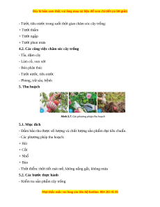 ệ chăm sóc cây tr ng ồ - Tỉa, d m ặ cây - Làm c , ỏ vun x i ớ - Bón phân thúc - Tư i ớ nư c, ớ tiêu nư c ớ - Phòng, tr s ừ âu, b nh ệ 5. Thu ho ch ạ 5.1. Mục đích - Đ m ả b o ả thu đư c s ợ ố lư ng và ch ợ t ấ lư ng s ợ n ph ả m ẩ đ t ạ tiêu chu n. ẩ - Các phư ng pháp t ơ hu ho ch: ạ + Hái + C t ắ + Nhổ + Đào - Th i ờ đi m ể : th i ờ ti t ế mát m , không n ẻ ng g ắ t ắ , không m a ư 5.2. Các bư c ớ th c hành ự - Ki m ể tra s n ả ph m ẩ cây tr ng ồ M i
