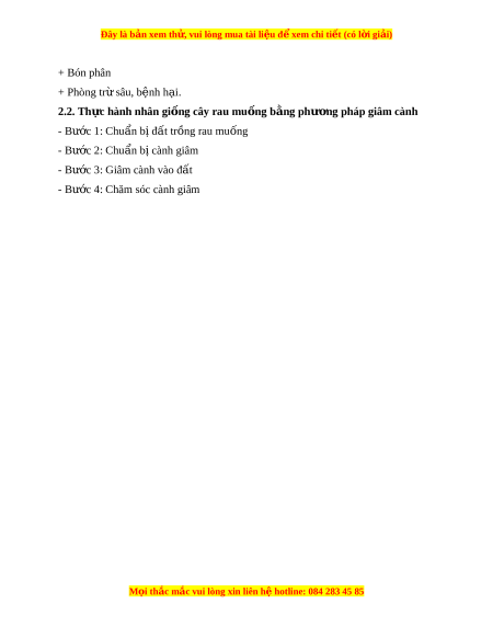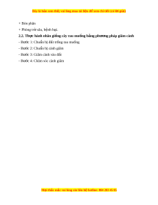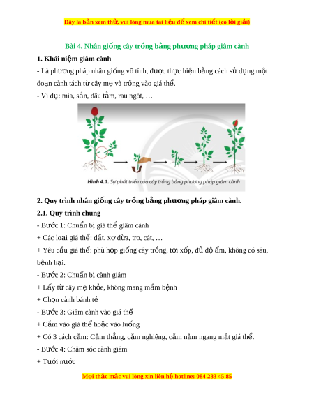 Đây là bản xem th , vu ử i lòng mua tài li u ệ đ xe ể m chi ti t (c ế ó l i ờ gi i ả ) Bài 4. Nhân gi ng ố cây tr ng ồ b ng ph ằ ư ng p ơ háp giâm cành 1. Khái ni m ệ giâm cành - Là phư ng pháp nhân gi ơ ống vô tính, đư c t ợ h c ự hi n b ệ ng ằ cách sử d ng m ụ t ộ đo n ạ cành tách t cây ừ m và t ẹ r ng vào gi ồ á th . ể - Ví d : ụ mía, s n, dâu ắ t m ằ , rau ngót, …