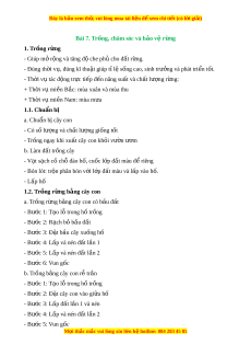Đây là bản xem th , vu ử i lòng mua tài li u ệ đ xe ể m chi ti t ế (có l i ờ gi i ả ) Bài 7. Tr ng, ồ chăm sóc và b o v ả r ệ ng ừ 1. Tr ng r ồ ng ừ - Giúp m r ở ng và t ộ ăng đ che ộ ph cho đ ủ t ấ r ng. ừ - Đúng th i ờ v , đúng kĩ ụ thu t ậ giúp t l ỉ s ệ ng cao, s ố inh trư ng ở và phát tri n t ể t ố . - Th i ờ v t ụ ác đ ng ộ tr c ự ti p ế đ n năng s ế u t ấ và ch t ấ lư ng r ợ ng: ừ + Th i ờ vụ mi n ề B c: ắ mùa xuân và mùa thu + Th i ờ vụ mi n ề Nam: mùa m a ư 1.1. Chuẩn bị a. Chuẩn b cây ị con - Có số lư ng ợ và ch t ấ lư ng gi ợ ng t ố t ố