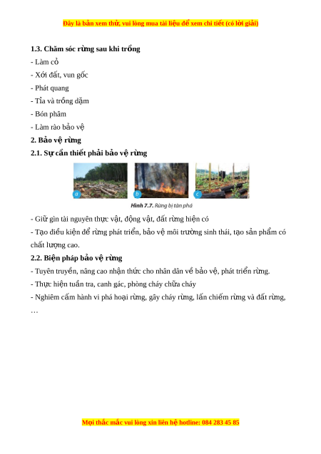 Đây là bản xem th , vu ử i lòng mua tài li u ệ đ xe ể m chi ti t ế (có l i ờ gi i ả ) 1.3. Chăm sóc r ng s ừ au khi tr ng ồ - Làm cỏ - X i ớ đ t ấ , vun g c ố - Phát quang - Tỉa và trồng d m ặ - Bón phâm - Làm rào b o ả vệ 2. Bảo vệ r ng ừ 2.1. Sự cần thi t ế ph i ả b o v ả r ệ ng ừ - Gi gì ữ n tài nguyên th c v ự t ậ , đ ng v ộ t ậ , đ t ấ r ng hi ừ n có ệ - T o đi ạ u ki ề ện đ r ể ng phát ừ tri n, b ể o v ả m ệ ôi trư ng ờ sinh thái, t o ạ s n ả ph m ẩ có chất lư ng cao. ợ 2.2. Bi n ệ pháp b o v ả r ệ ng ừ - Tuyên truy n, nâng cao nh ề n ậ th c cho nhân dân ứ v b ề o v ả , phát ệ tri n r ể ng. ừ - Th c hi ự n t ệ u n t
